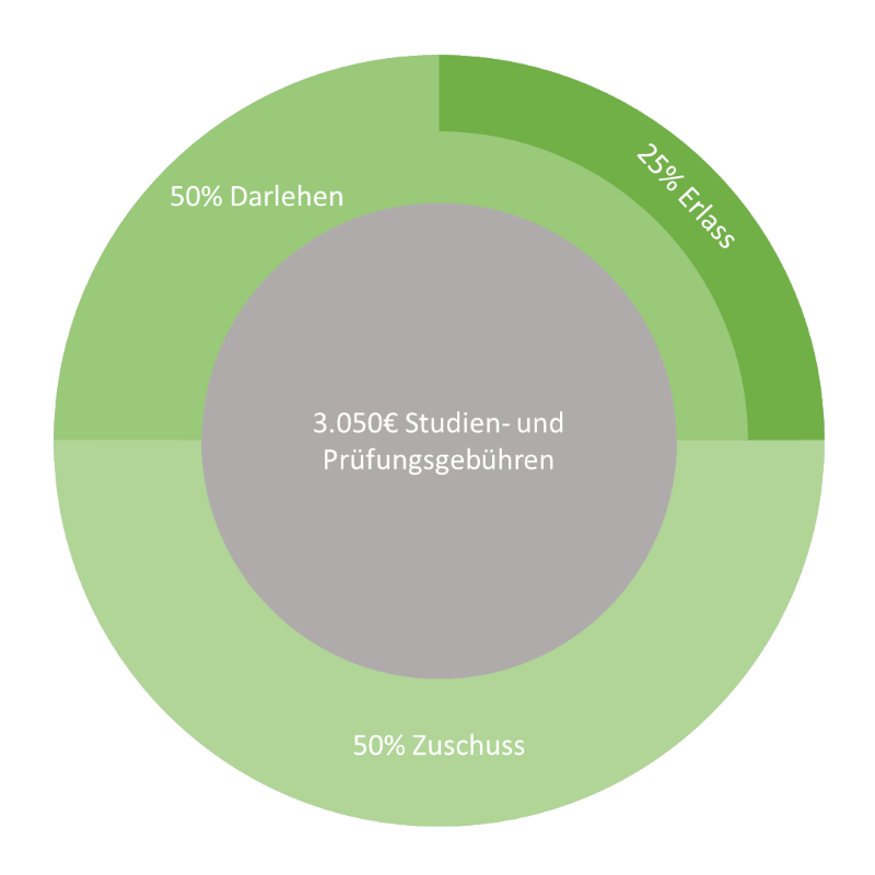 Dabei werden 50 Prozent der Studien- und Prüfungsgebühren als Zuschuss gewährt. Den Restbetrag (50 Prozent) beantragen Sie als Darlehen bei der KfW. Nach bestandener IHK-Prüfung werden 50 Prozent des noch offenen KfW‑Darlehens erlassen.